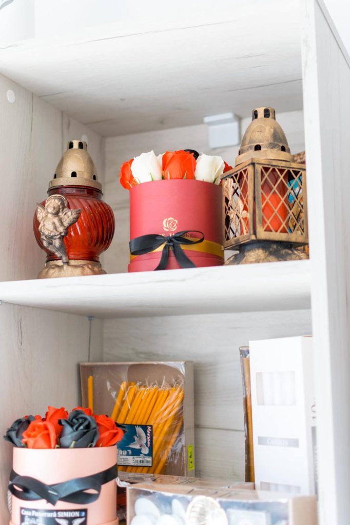 - Candele, lumânări, rame foto, crucifixuri, colivă, colaci, prosoape și batiste funerare